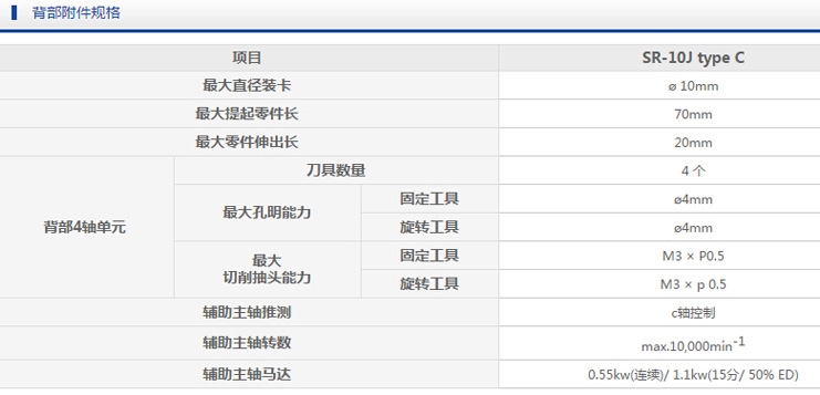 产品概述:SR-10J typeC包括主轴,副主轴的C轴控制(带锁定)为标准装备。设定预先准备工作时方便的手动脉冲发生器作为选购项。采用倾斜性燕尾槽导轨构造,提高刀架台刚性。